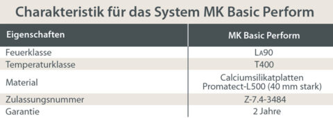 Das Schachtsystem MK Basic Perform besteht aus industriell gefertigten Schachtelementen sowie entsprechenden Zubehörteilen. Es besitzt die Feuerwiderstandsklasse L90 (EI90) und wurde mit thermischer Vorbehandlung geprüft.