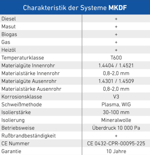 MKDF ist ein doppelwandiges System, welches für Geräte wie zum Beispiel Dieselmotoren, Stromgeneratoren, Dampfgeneratoren sowie zur Ableitung von industriellen Dämpfen entwickelt wurde. Es eignet sich im Dauerbetrieb für verschiedene Arten von Installationen, welche eine sehr hohe Dichtheit erfordern. Das System kann im Überdruck über H1 5000 Pa betrieben werden. Es ist sowohl für die trockene als auch für die feuchte Betriebsweise, bei einer maximalen Temperatur von 600°C, geeignet.