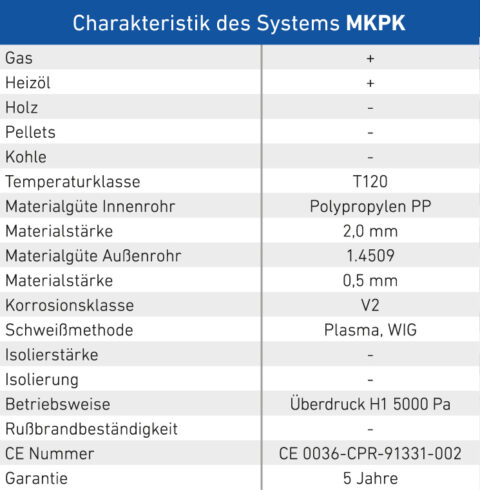 MKPK ist eine hochwertige konzentrische Systemabgasanlage mit Innenrohr PP (Polypropylen) und Außenmantel Edelstahl. Sie wird im Außen-und Innenbereich eingesetzt zur Ableitung der Rauchgase von Brennwertfeuerstätten und BHKWs bei raumluftunabhängiger Betriebsweise. Die Montage ist OHNE Außenklemmband möglich. Das Innen- sowie das Außenrohr wird werkseitig mit einer Dichtung versehen.